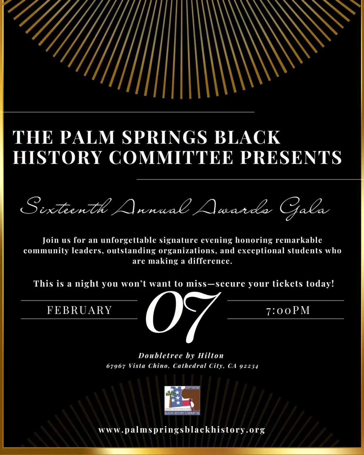 The 16th Annual Palm Springs Black History Awards Gala, hosted by the Palm Springs Black History Committee, will be held on February 7, 2026. This prestigious event recognizes individuals, groups, and local and corporate businesses whose dedication, advocacy, and contributions have advanced the success and achievements of African Americans and enriched our broader community.